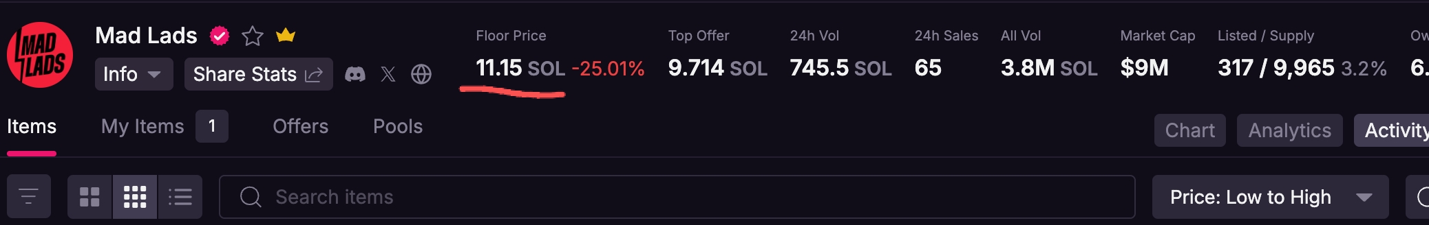 Foresight News 消息,据 Magic Eden 数据,BackPack 相关 Solana 生态 NFT 项目 Mad Lads 地板价跌至 11.15 SOL,24 小时跌幅为 25.01%,30 日跌幅为 44.16%。目前该系列挂单数量为 317 枚,占总供应量的 3.18%,总市值约 900 万美元。