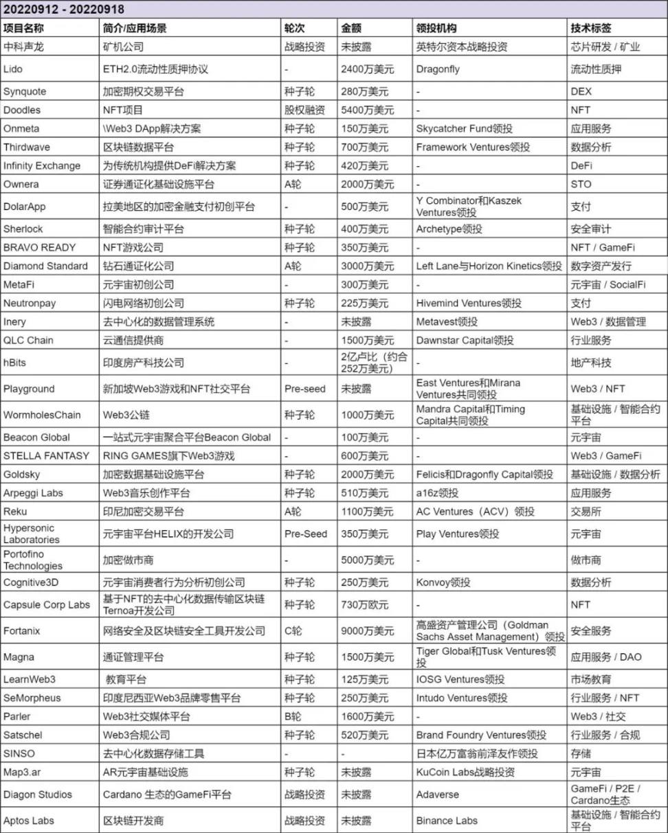 上周公布的海内外区块链融资事件 37 起,较上周数量减少,已披露融资规模超过 43862 万美元。上周最大笔融资事件为区块链安全工具开发公司 Fortanix 获得的 9000 万美元 C 轮融资。此外,较大额度的还有加密做市商 Portofino Technologies 完成的 5000 万美元融资、NFT 项目 Doodles 以 7.04 亿美元估值完成的 5400 万美元融资。上周发生在基础设施及行业服务类的融资事件最多,数据分析及数据管理平台数量达到 4 起,通证管理、托管等行业服务平台的融资达 4 起,其中最大的一笔是通证管理平台 Magna 以 7000 万美元的估值完成了 1500 万美元的种子轮融资。