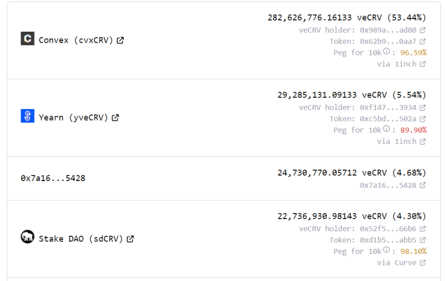 在这场争夺 CRV 资源的 Curve War 中,有一个项目已经成为了实际的大赢家,它就是 Convex。作为一个收益聚合平台,Convex 汇集用户的资产去获取更多的 CRV,进而在投票中能够获取最大的收益。目前 Convex 持有 2.8 亿枚 veCRV,占总数的 53.4%,遥遥领先第二名。