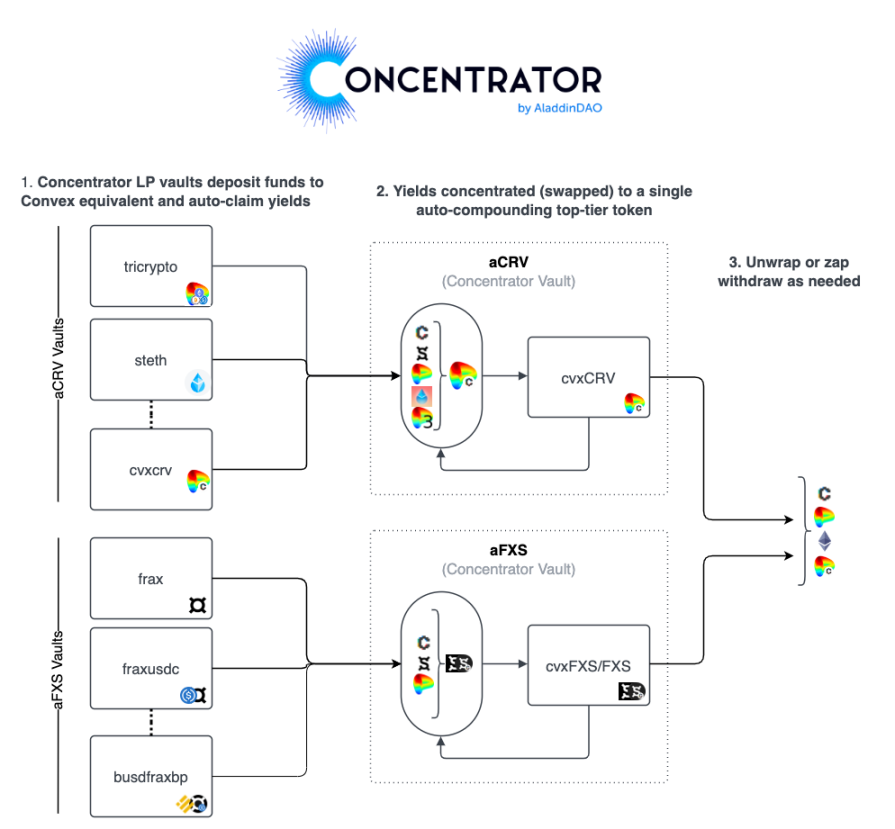 Concentrator 作为一个收益聚合、自动复投的工具,旨在最大化 Convex APY 并在最优 DEFI 代币中获得收益。