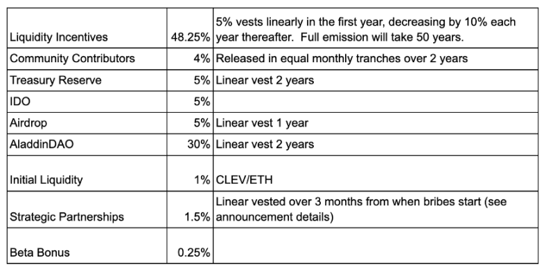 同时 CLEV 也借鉴了 Curve 的 ve 模型,用户锁定 CLEV 可以享受治理投票、协议收益分享(至少 75% 协议收益会分配给锁定者),锁定的时间越长(最长 4 年)获益越多。Curve 的历史已经向我们表明,ve 模型能非常好的稳定币价,市场几乎没有抛压,同时未来是否会出现争夺 CLEV 资源的现象犹未可知。