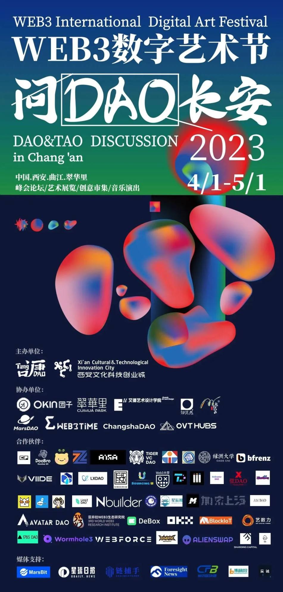 由 Tang DAO 发起,西安文化科技创业城、曲江翠华里、西安 OKIN 团子、知其然 lab、Mars DAO、OVT Hubs、Changsha DAO、麻绳音乐、WEB3TINME 联合举办的“问 DAO 长安·WEB3 数字艺术节”将于 2023 年 4 月至 5 月在西安曲江新区翠华里举行。艺术节开幕式为 4 月 1 日,行业峰会、Web3 创意周边集市、DAO's Day、现场音乐演出将于 4 月 1 日至 2 日举行,NFT 艺术展览、线下分享沙龙、NFT 数字艺术创作比赛将贯穿整个艺术节始末,闭幕式于 5 月 3 日举行。
