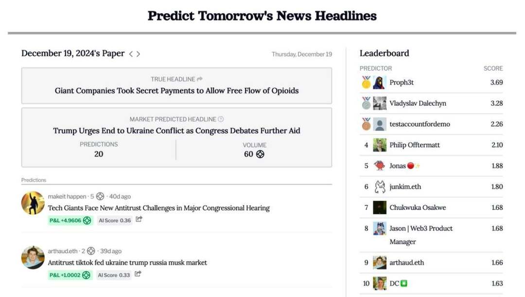 奖励根据预测标题与实际标题在语义上的相似度分配,使用大语言模型(LLM)进行评估。市场通过区块链上的加密验证方式解析,确保透明性和无需信任的验证,平台基于 Base 构建。