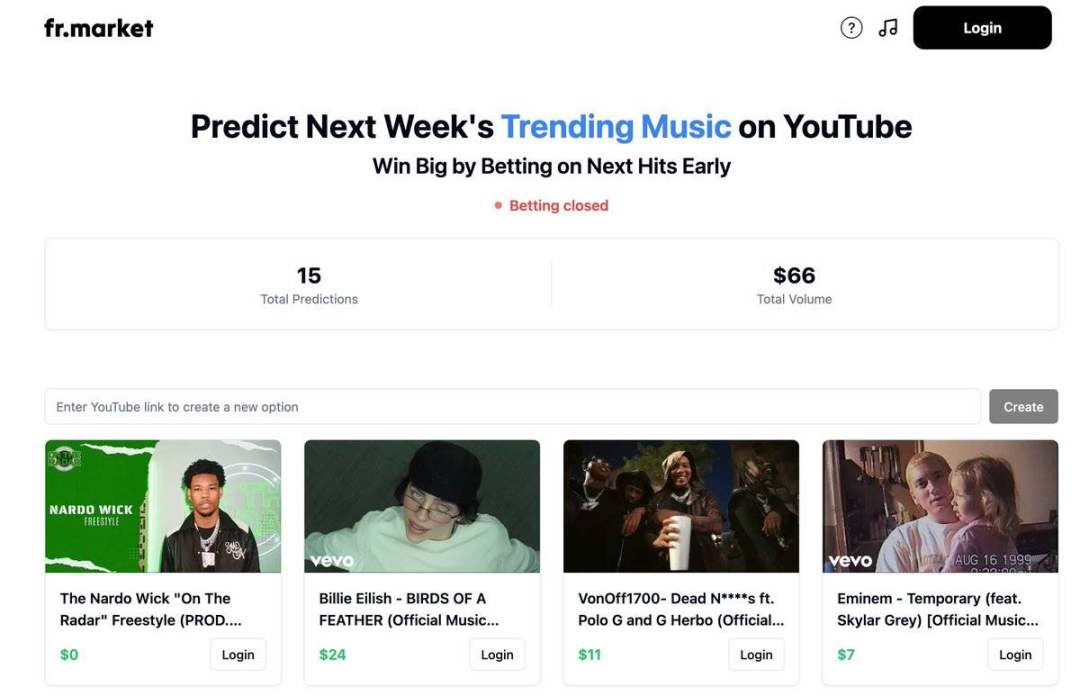 fr.market 是一个将音乐偏好游戏化的平台,用户可以根据对其他人音乐喜好的预测或音乐趋势下注。
