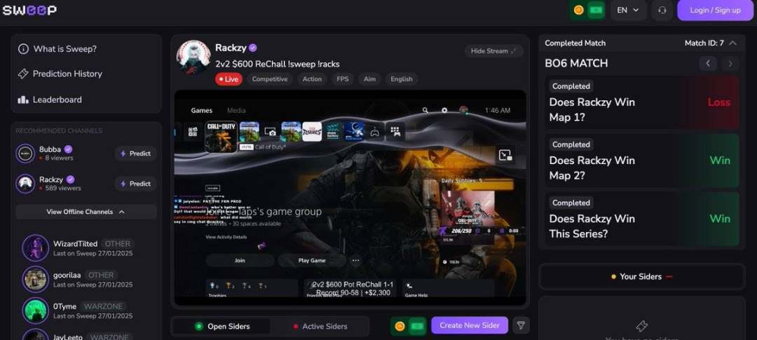 Sweep 是一个围绕直播内容设计的游戏化预测平台,用户可以在直播活动中下注,例如「XX 是否会在比赛中获得 15 次击杀」,并使用两种不同的货币进行投注。