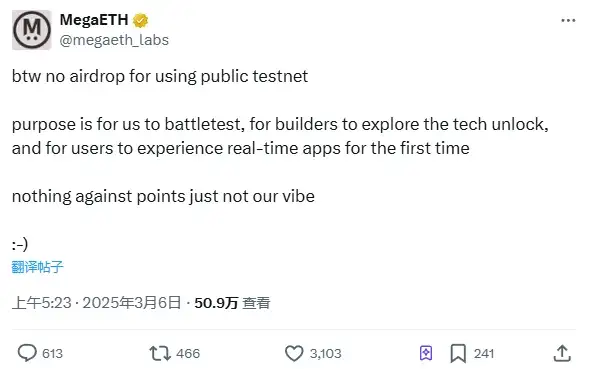 昨日,MegaETH 在 X 平台发文表示,不会为公共测试网交互行为提供空投奖励,测试网的目的是进行实战测试,让开发者进行技术探索,让用户进行应用体验,(给测试网空投)不符合我们的作风。