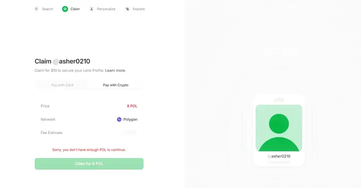 第二,铸造一个 Lens NFT(需要花费 8 枚 POL 代币),