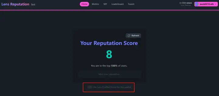 第三,铸造一个 Reputation 后即可获得 SBT 积分(需要现有 Lens NFT 才可以进行),