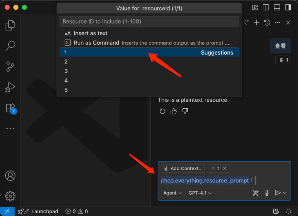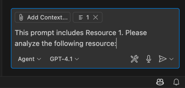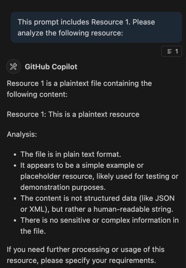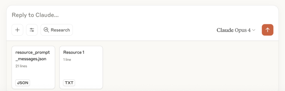 完成后 Resources 和 Prompts 则会以上传文件的形式出现在对话内容中。