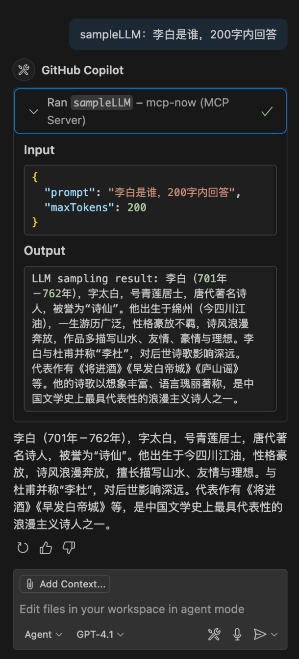 everything 中提供的 sampleLLM 工具可以调用这个功能。在 Copilot 中进行测试。