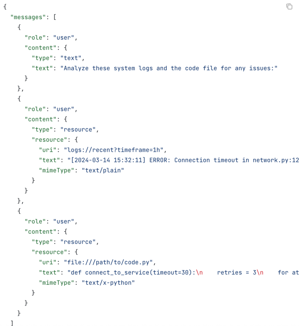 从数据结构上可以看出,在 MCP 协议的设计上,补全后的 Prompt 应该直接以对话消息的形式注入到聊天历史中,开启下一轮对话,从而复用预先由开发者构造好的优质 Prompt。
