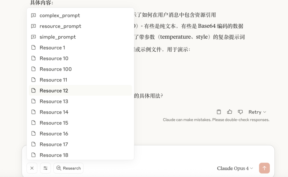 可以看出目前 Claude Desktop 并不区分 Resources 和 Prompts,也并未针对这两类特殊内容在对话中有针对性的处理,内容只是以简单的文本信息补入对话中。大模型实际并不能很好地针对性处理这些内容。