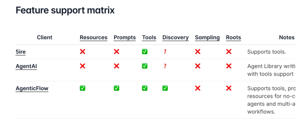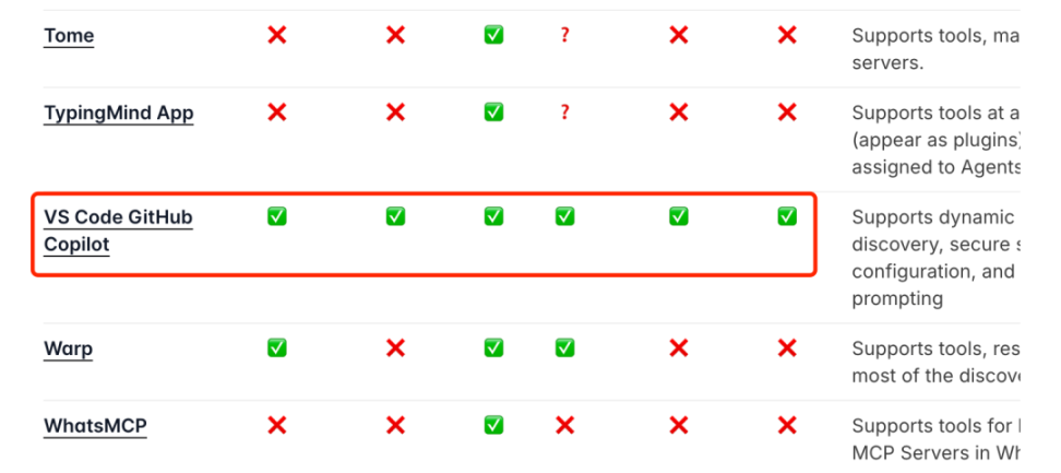 在目前 MCP Spec 中列出的数十个 Host/Client 实现中,VS Code GitHub Copilot 是唯一一个实现了全部特性的 AI 应用(不算某些 Agent 框架)。