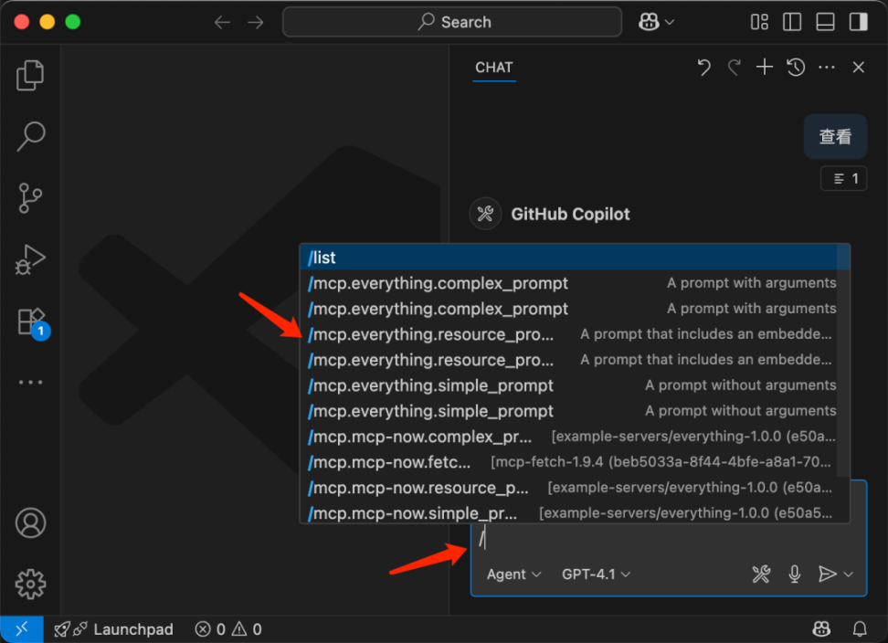 可以展示出已经安装的 prompt 模板。(由于 VS Code 会自动加载 Cursor、Claude 等其他友商的 MCP Server 配置文件,所以工具列表显得有点杂且重复。)