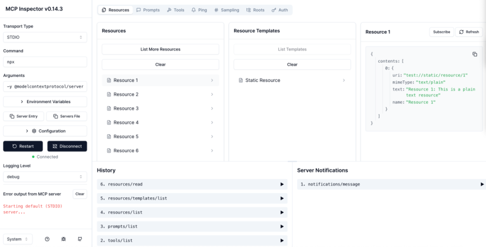 inspector 连接 server-everything 的效果图如下: