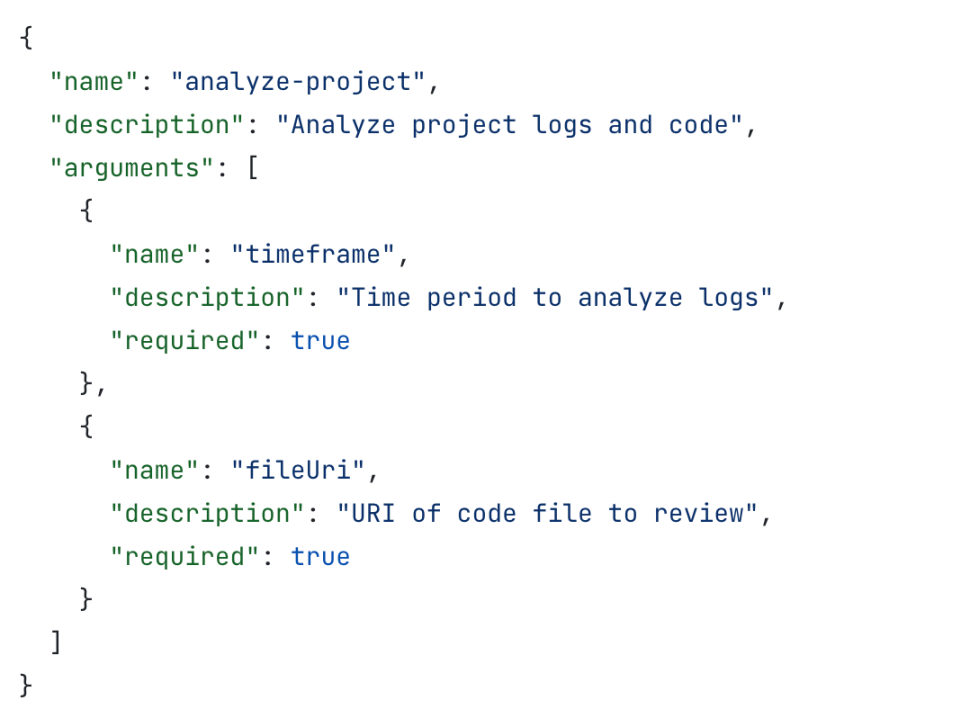 Prompt 在 MCP 协议 Spec 中的示例如下: