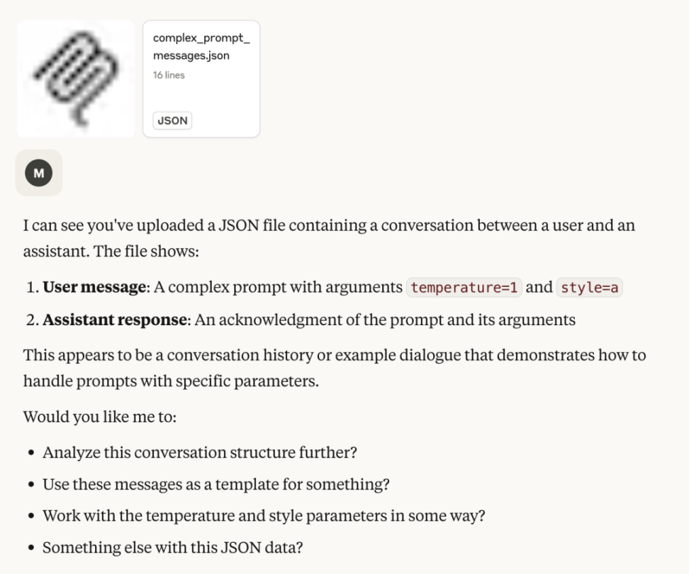 由于目前 Claude Desktop 的实现中 Prompt 与普通数据上传无异,会以 JSON 文本的形式插入到聊天内容中,对 AI 来说,会显得莫名其妙摸不着头脑。