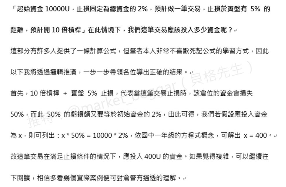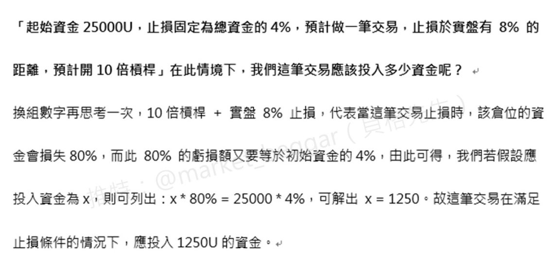 简单来说,就是在做好交易计画之后,最终决定进场之前,你永远都要先问自己「这张单子如果止损了,我愿意亏多少钱?」
