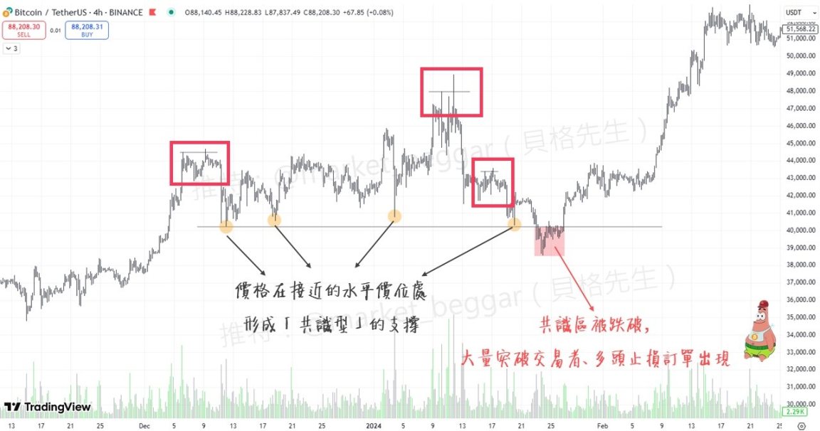 举例来说,当一个「非常明显的『支撑区间』」被跌破之后,市场上会出现两种「一致性极高」的订单,分别是: