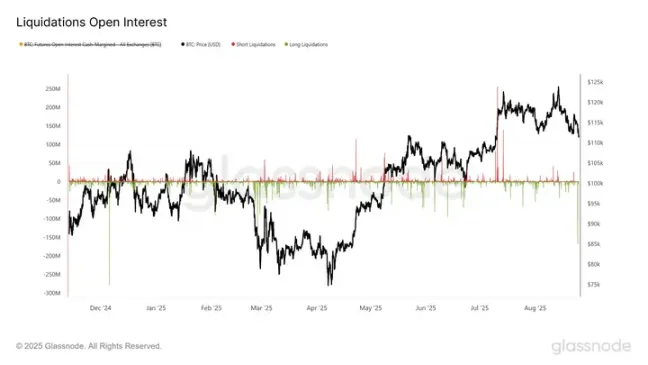 Coinglass 数据显示,全网过去 24 小时爆仓达到 9.35 亿美元,其中多单爆仓 8.21 亿美元,多头再度遭受重创。8 月 24 日,glassnode 数据显示,市场短时间超 1.5 亿美元的多头被迅速清算,成为 2024 年 12 月以来 BTC 多头清算最大的事件之一。