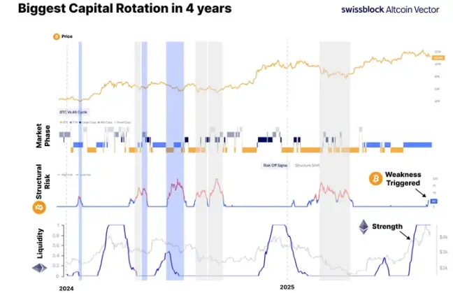 若要以太坊引领市场,比特币必须守住关键位置——资金轮动正推动以太坊迈向周期领涨地位。这像是本轮周期最终阶段来临前的最后一次重大考验。