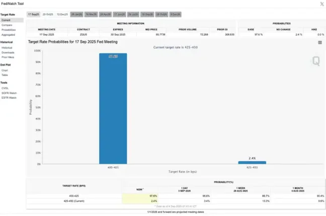 对于比特币投资者来说,劳动力市场放缓的迹象可能是美联储考虑降息的信号。芝商所的 FedWatch 工具目前显示,美联储在 9 月会议上将基准利率下调 25 个基点的可能性为 97.6%,许多交易员预计此举将引发比特币价格的反弹。