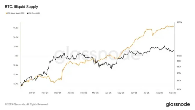根据 Glassnode 数据,截至 8 月底,比特币「非流动供应量(Illiquid Supply)」突破 1,430 万枚,再次刷新历史纪录,表明长期投资人持币行为稳定、囤币情绪浓厚,构成了市场上最稳固的支撑力量。