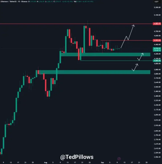 相反,如果 ETH 未能抵挡卖方的压力,则可能不得不重新测试重要的支撑位。短期内,4,100 美元至 4,200 美元的价格区间被视为第一层缓冲。在更悲观的情况下,4,060 美元和 3,880 美元区域将充当深度支撑位,以维持长期增长结构。