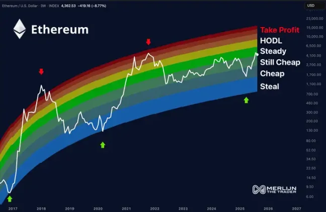 累积图显示 ETH 处于 4,362 美元左右的“稳定”区域,略高于“仍然便宜”区域,而“仍然便宜”区域通常与长期投资者和机构投资者的累积阶段相关。