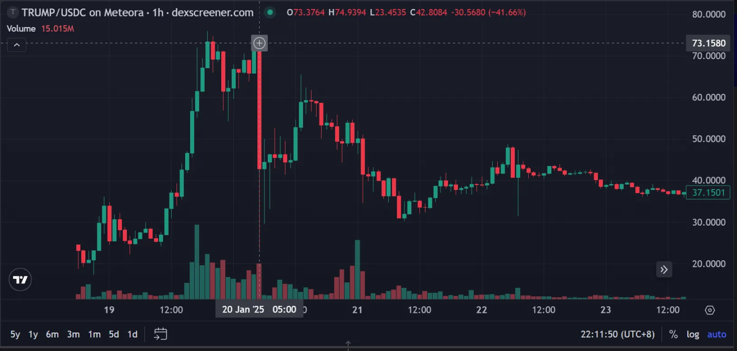 TRUMP 代币经历了典型的抛物线式暴涨。价格从低点快速攀升至峰值约 $75 附近,这与我们之前分析的 $75.35 历史高点完全吻合。成交量在这个阶段异常放大,绿色柱状图显示买盘极其活跃,反映出"总统发币"这一史无前例事件引发的巨大 FOMO 情绪。