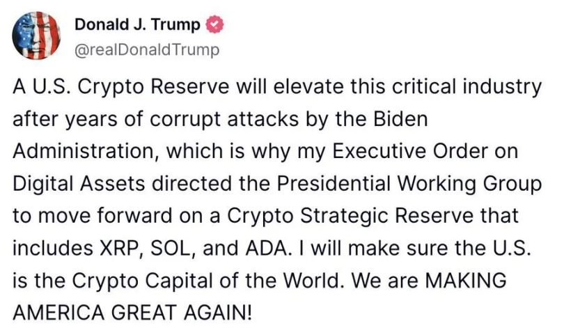 3 月 3 日,Trump 通过两条连续推文。第一条推文宣布"U.S. Crypto Reserve will elevate this industry"并指定 XRP、Solana、Cardano 为储备币种;一小时后补充"I also love Bitcoin and Ethereum!"。