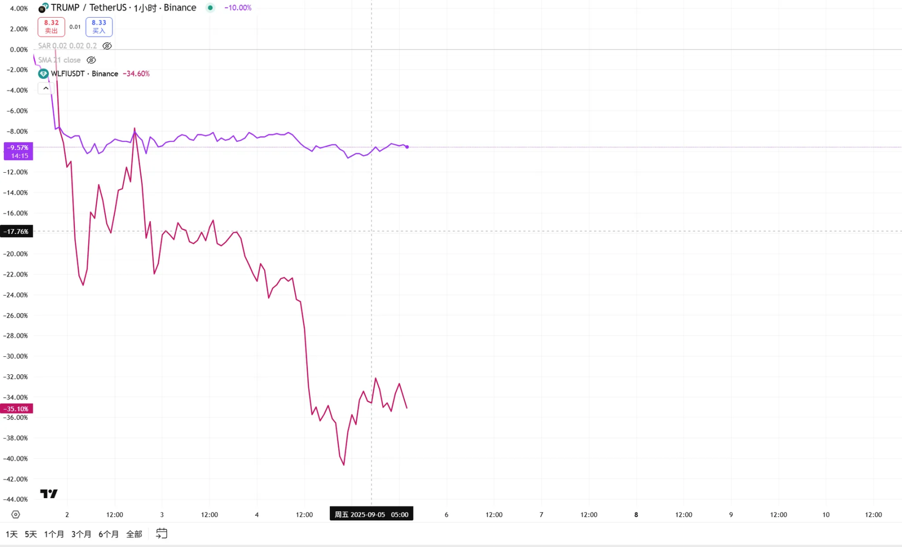 但在 WLFI 一路走低的情况下,Trump 却没有受到影响,依旧保持横盘。