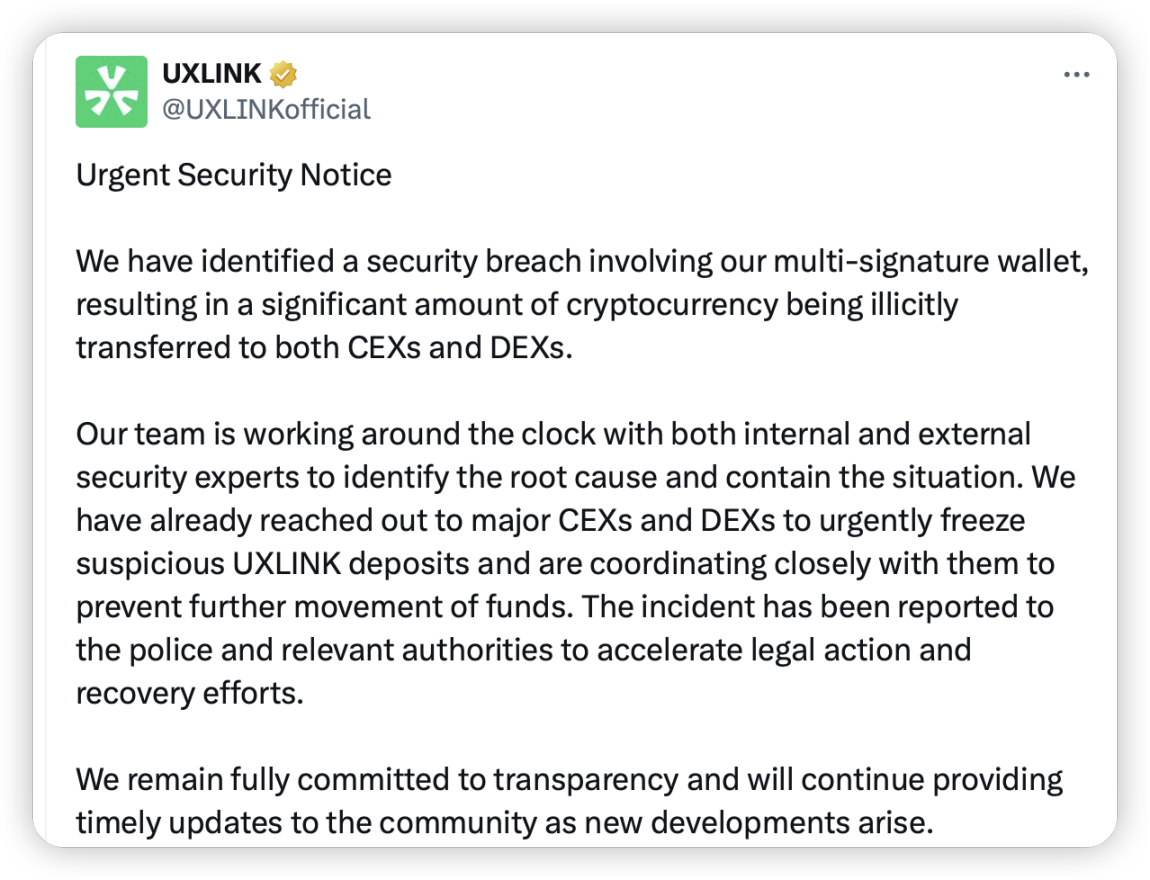 9 月 23 日,UXLINK 项目多签名钱包私钥泄漏,导致约 1130 万美元资产的加密货币被盗取,并已被分散转移至多个中心化 (CEX) 和去中心化 (DEX) 交易所。在被攻击的第一时间,我们与 UXLINK 一起调查分析这起攻击以及监控了资金流动。UXLINK 紧急联系各大交易所请求冻结可疑资金,已向警方及相关机构报案以寻求法律支持和资产追回,黑客的大部分资产已被各大交易所标记冻结,从而最大程度地降低了社区面临的进一步风险。项目方承诺将对社区保持透明,ExVul 也将持续分析跟进事件进展。