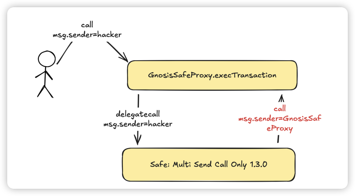 3.在调用 execTransaction 时,攻击者在其 data 参数中指定了一个恶意操作:通过 delegatecall 方式调用 Safe: Multi Send Call Only 1.3.0 实现合约。