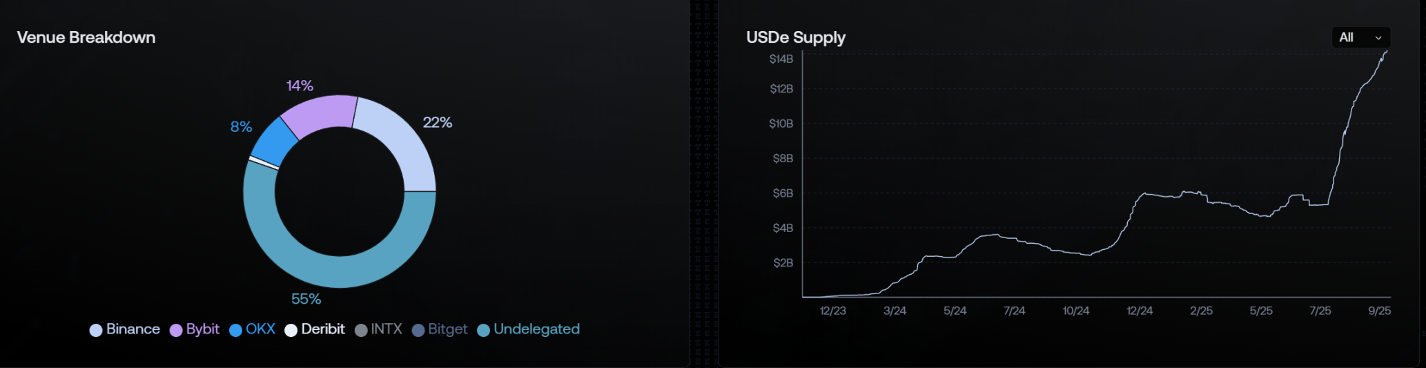 自 2023 年 11 月正式推出以来,USDe 在不到两年时间内,总流通市值从 0 快速增长到 140 亿美元量级,期间仅经历过两次回撤,并能迅速恢复增长,尤其是今年 7 月以来,更是在短短两个月左右的时间,从约 50 亿美元飙涨近两倍,并被多家头部 CEX 深度集成。