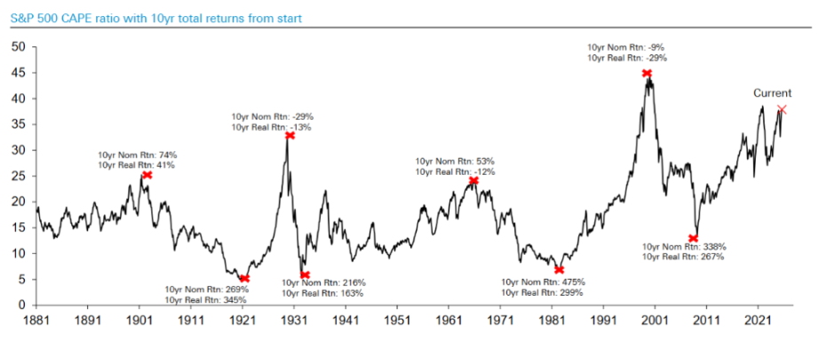 首先是估值。报告图表显示,当前美股的市盈率(CAPE ratio)比例已攀升至历史高位,仅次于 2000 年科网泡沫的顶峰。历史数据无情地揭示了一个规律:每当估值达到如此高点时(如 1929 年、2000 年),随后十年的市场回报,尤其是剔除通胀后的真实回报,往往是负值。