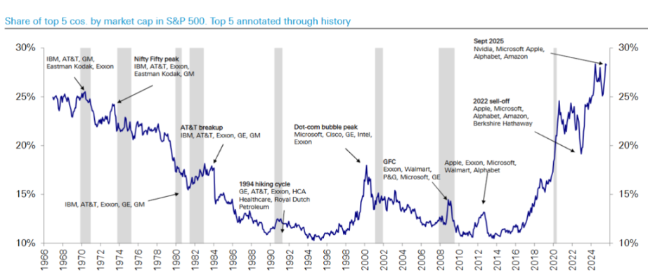 这一集中度不仅远高于 2000 年科网泡沫时期的水平,甚至超越了上世纪 70 年代初「漂亮 50」行情最火热的时刻。报告指出,这并不必然意味着泡沫,但它确凿无疑地表明市场已进入「未知领域」,整体表现过度依赖于少数几家公司的命运。