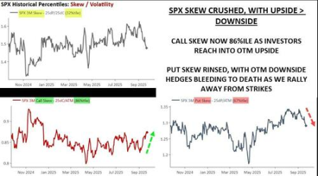期权市场的表现尤为引人注目。SPX 指数期权偏斜度(Options Skew)正「从悬崖上俯冲」,看涨期权需求相对于看跌对冲工具急剧上升,看涨期权偏斜度(Call Skew)更是飙升至年初以来的最陡峭水平,这表明投资者在为「股市继续疯涨」竞相购买上行保护。而看跌期权(即下行保护)则在市场不断冲高之际因成本消耗而逐渐被抛弃。