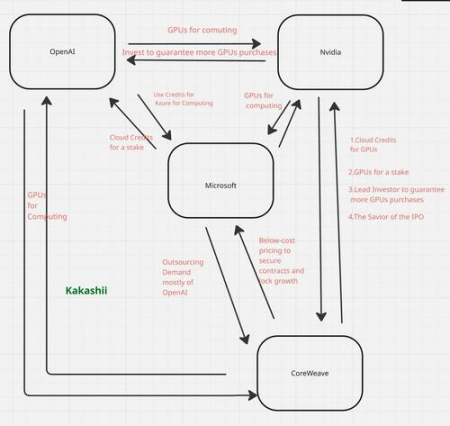 尽管牛市理由充分,但 McElligott 也指出了市场中一些令人不安的现象。他提到,近期科技巨头之间的合作公告,揭示了一种日益危险的循环「AI 收入 / 资本支出」模式。在这种模式下,巨头们将数十亿美元资金在彼此之间来回投入,进行资本重组。