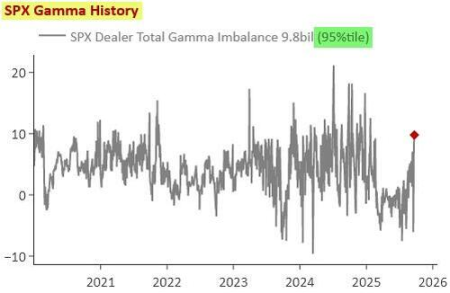 野村的警告核心在于市场的技术结构已变得极度脆弱。目前,来自各类波动率卖出策略的供应,使得做市商在平价期权(At The Money)附近积累了今年以来最庞大的伽马多头敞口(long Gamma),这种状况压制了市场的短期波动,形成了「缓慢碾压式」的上涨。