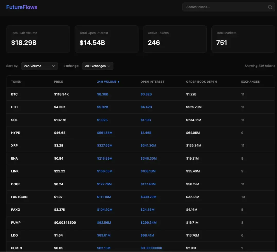不同于 Coinglass 的代币交易量的热力图,Future Flows 提供的是更加整体性的数据,他收录了市面上大部分的 PerpDex 数据,而从这个看板上可以聊到到大部分代币的整体链上交易情况。