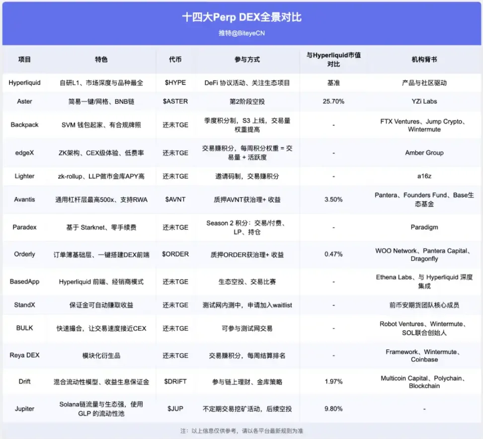 Binance 系(Aster、StandX)、Amber 系(edgeX)、Paradigm 系(Paradex)、Solana 系(BULK/Backpack/Jupiter/Drift)、Base 系(Avantis)…… 各有版图。
