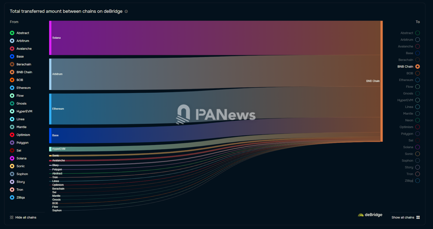 资金流动方面,近一周内 BSC 的净流入资金约为 7350 万美元,是流入资金量第三的公链。从 deBridge 的数据来看,流入主要来自 Solana、Arbitrum 和以太坊主网。