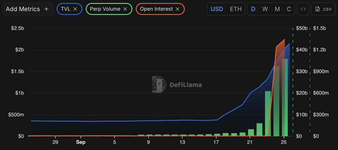 与此同时,Aster 的未平仓合约量(OI)激增约 33 倍(从 370 万美元增长至 9 月 24 日的 13 亿美元),锁仓总价值(TVL)在 30 天内激增约 500%。相比之下,Hyperliquid 平台同期的各项指标均呈现稳定的自然增长态势。