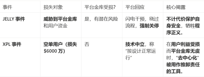 双重标准的利益计算逻辑:这种截然不同的处理方式暴露了清晰的利益计算公式:JELLY 事件威胁平台金库,触发干预;XPL 事件仅损害用户利益且平台金库未受损,选择忽视。平台自身的资金安全始终是第一优先级,所谓的去中心化原则只是在不威胁平台核心利益时的装饰品。用户的 6000 万美元损失在平台眼中只是「市场风险」,而平台的潜在损失则需要通过破坏去中心化来紧急救援。