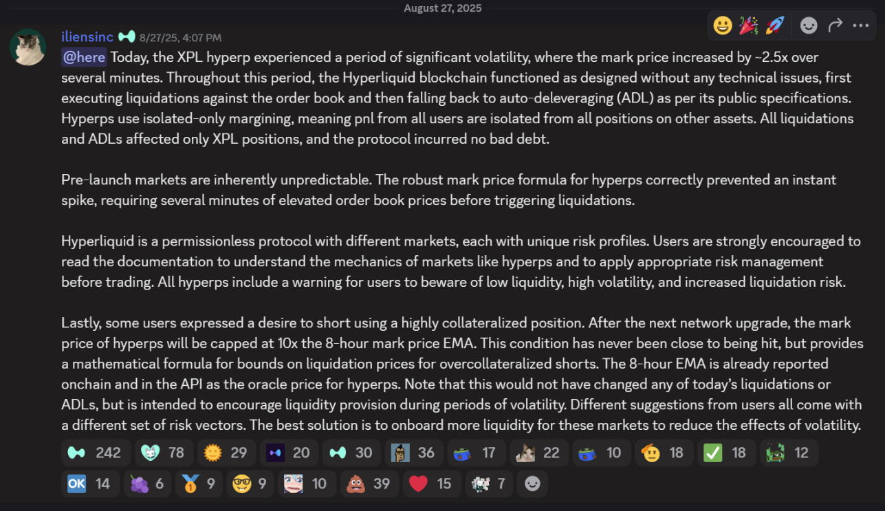 平台在官方 Discord 中回应:「XPL 市场经历了剧烈波动,但 Hyperliquid 区块链按照设计正常运行,没有出现任何技术问题。清算和自动减仓机制均按公共协议执行,且由于平台采用完全隔离的保证金制度,此次事件仅影响了 XPL 头寸,协议并未产生任何坏账。」