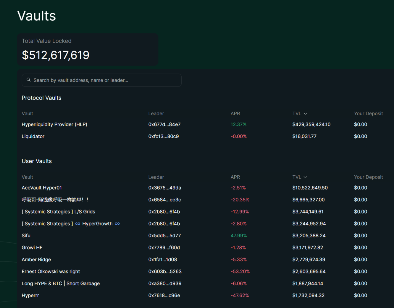 根据最新数据,Hyperliquid 总 TVL 达 5.12 亿美元,其中协议金库 HLP 占据 4.29 亿美元,占比 84%。成为协议的「影子央行」或「特权阶层」。相比之下,所有 User Vaults 合计约 8300 万美元,分散在数百个独立金库中。