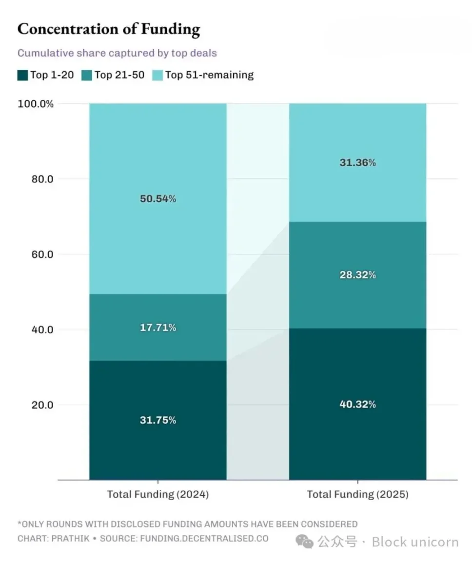 2025 年排名前 20 的轮次占全部融资的 40%,而 2024 年为 32%。放大到前 50 轮,这一比例从 2024 年的 49% 膨胀到今年的 69%。