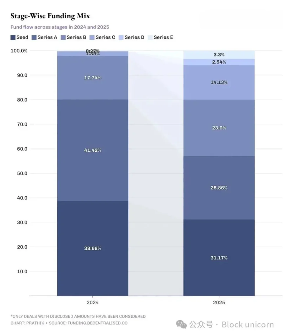 种子轮和 A 轮的占比下降,而后期阶段的融资占比增加。大约 57% 的资金投入到加密项目的早期阶段(种子轮和 A 轮),而 2024 年前九个月这一比例为 80%。
