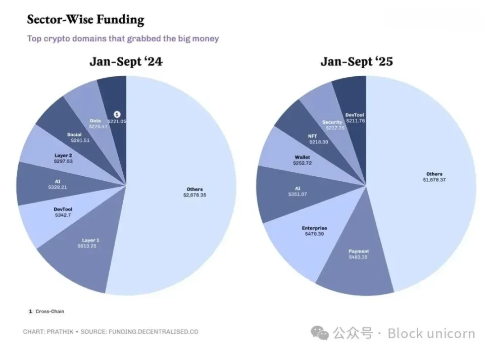 对创始人来说,这意味着如果你在 AI、支付、企业基础设施和现实世界资产代币化(RWA)领域创业,资金是存在的。在这些领域之外,诸如 Layer-1 和 Layer-2 基础设施、开发者工具和社交等领域的资金已经枯竭,而这些领域在 2024 年构成了行业精华。